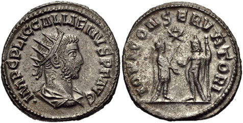 | Valerianus geen equivalent. | Göbl 1697Ab Gallienus antoninianus. IOVI CONSERVATORI |